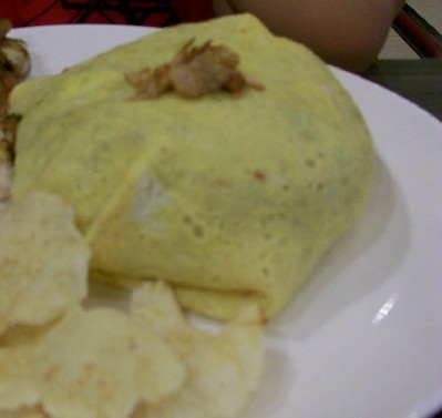 Nasi goreng kari pesanan Nanda…? Waduh…. Ini yang jadi kejutan buat Tati.. Nasi ini dihidangkan dalam keadaan dibungkus dengan telor dadar yang rasa2nya kayak roti canai.. Rasanya mirip dengan rasa nasi briyani, yang jadi favorite Tati kalo jalan2 ke Food Republic di Wisma Atria atau ke Little India. Sampai2 dikomentarin Eko, yang jadi teman jalan, “Kamu tuh turunan India, apa? Kok doyan banget ama nasi Briyani?” Turunan India dari Hongkong? Mata Tati sipit dan idung melesek ke dalam, gini? Hehehe.. Btw, Tati emang seleranya rada India deh.., karena pernah juga tuh falling in love ama turunan India..!!! Huahahaha. Yang gak doyan dari India tuh, film-nya yang ketemu tiang nyanyi, ketemu kembang nyanyi.., halah..!!!