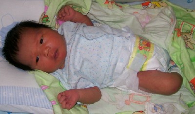 Matanya sipit kayak mata Enek, Tati dan Mami Uli… Rambutnya hitam & jigrik.., kayak Papi David & Mami Uli, kali yaa… Rambut mereka tuh seratnya kasar dan hitam.. Hidungnya…? Hidung jambu lah yaawww… it’s our family trade mark.. Hehehe…