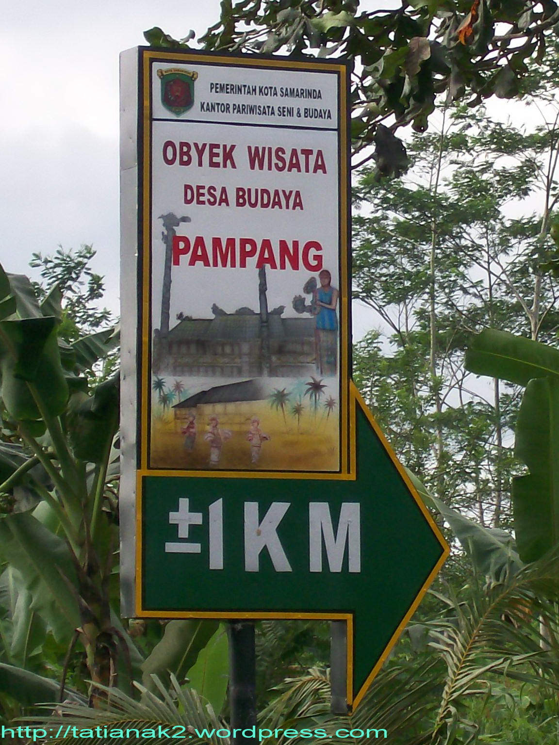 Desa Pampang adalah pemukiman suku Dayak Kenyah yang berada di pinggiran kota Samarinda, hanya beberapa belas kilometer deh kayaknya. Secara administrasi masih masuk Kota Samarinda, kalo gak salah. Di desa ini setiap minggu siang ada pertunjukan kesenian masyarakat Dayak Kenyah. Naahhh pada waktu itu kita bisa melihat orang-orang tua suku Dayak dengan kuping yang panjang dan anting-anting besar. Mereka hadir di Rumah Panjang yang menjadi lokasi pertunjukan. Di situ juga dijual berbagai kerajinan hasil karya penduduk desa Pampang, berupa hiasan kepala, baju tradisional, gantungan kunci dll, yang semuanya berhiaskan manik-manik dan payet-payet berwarna warni. Bahkan waktu Tati ke sana pada bulan Agustus 2006 Tati juga ngeliat mereka menjual hasil-hasil kebun mereka pada para pengunjung.