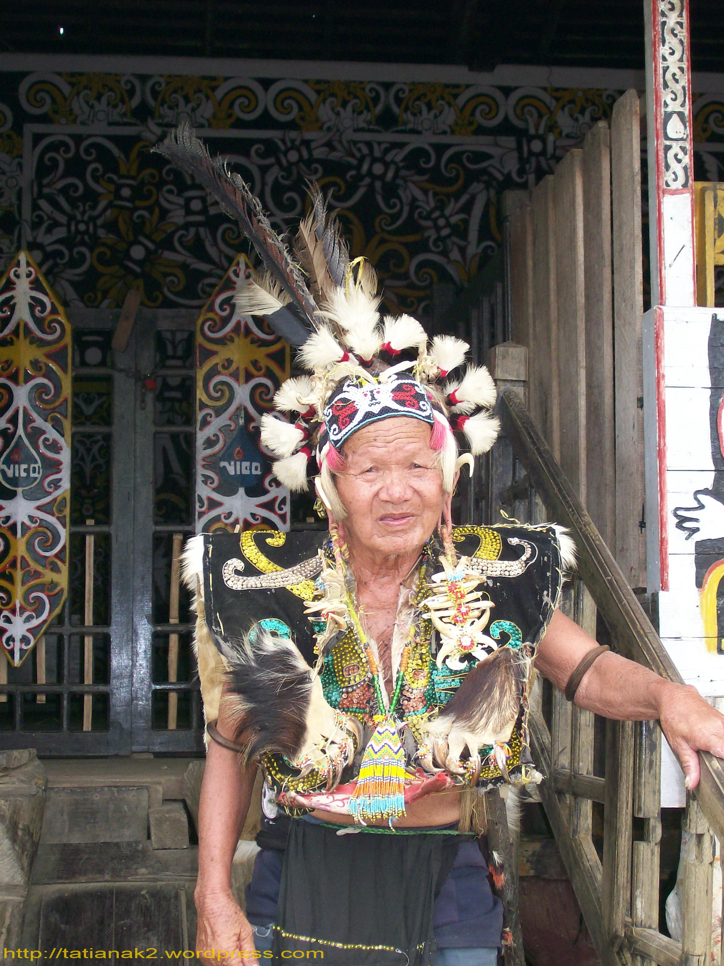 Ini foto dari si Bapak Berkuping Panjang yang udah pernah Tati ceritain di postingan yang ini. Ternyata beliau adalah salah seorang tetua masyarakat Dayak Kenyah yang menetap di Desa Pampang, yang secara bergiliran bertugas menerima tamu di Rumah Panjang. Kelihatan gak daun kupingnya yang panjang dan digantungin assesories...? Beneran unik, kan?