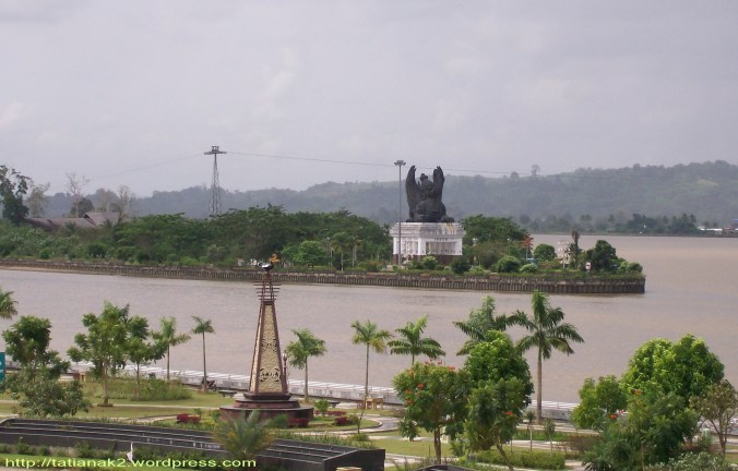 Di ujung Pulau Kumala terlihat patung Lembuswana, simbol Kabupaten Kutai Kartanegara yang dibuat oleh seniman Nyoman Nuarta. Lembuswana adalah sosok perpaduan berbagai binatang. Seperti kuda tapi bersayap, bersisik, berbelalai, bergading, bertaji bahkan pake mahkota pula.. Kayaknya sosok ini bersumber dari hikayat setempat. Sayang ya, posisi patung Lembuswana-nya duduk. Kebayang gak siyy kalo posisi Lembusawa-nya berdiri pada dua kaki belakang sedangkan dua kaki depan terangkat tinggi…??? Pasti akan lebih keren lagi… Patung Lembuswana dalam ukuran-ukuran yang lebih kecil bertebaran di sepenjuru Kota Tenggarong dan di perbatasan Kabupaten Kutai…