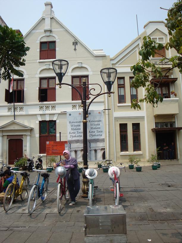 Di depan Museum Wayang, kami melihat sederetan sepeda, yang dicat warna warni… Lucu dan cantik.. Oooo la laaaa…. Ternyata sepeda-sepeda itu disewakan, dan penyewa bisa bersepeda mengelilingi alun2 yang ada di tengah2 bangunan-bangunan tua ini.. Bahkan para wisatawan bisa menyewa lengkap dengan pengayuhnya, alias ojek sepeda untuk ke obyek-obyek wisata yang masih terkait dengan Wisata Kota Toea Djakarta, seperti Museum Maritim dan Menara Bandar Djakarta….