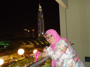 Setelah terbangun dan menyadari bahwa aku sedang tidak di rumahku, dan waktu subuh juga belum sampai, aku tetap berdiam diri di tempat tidur.. Lalu memandang jejeran pencakar langit yang memancarkan cahaya di kegelapan malam.. Sekali lagi aku terpana akan rahasia keajaiaban rezeki.. Tidak pernah ada dalam semesta pemikiranku bahwa pada akhir tahun 2010 ini aku akan berada di sini, menikmati cahaya gemerlap Dubai.. Gak lama aku mendengar suara bell … Hhhhmmmm… somebody’s coming… Itu pasti teman sekamarku yang telat datang karena visanya terlambat terbit.. Aku lalu bangun dan mengintip dari kaca pengintip yang ada di pintu kamar… Aku melihat wajah bang Ferry, tour leader kami, wajah seorang perempuan dan petugas hotel.. Itu pasti bang Ferry mengantarkan teman sekamarku yang baru tiba di Dubai.. Aku lalu membuka pintu dan mempersilahkan teman sekamarku masuk tanpa menampakan diriku.., soalnya cuma pakai baju tidur tanpa kerudung.. Hehehe… Aku lalu mendengar bang Ferry berkata, “Ini mba Afni, teman sekamarnya ya mba Sondha.”. Aku lalu menjawab, “Ok, bang Ferry.”` Aku dan Afni lalu saling memperkenalkan diri. Aku lalu menunjukkan padanya pemandangan indah dari balkon kamar. Lalu dia melanjutkan dengan bebersih dan bergegas istirahat…, dan aku melanjutkan berbaring di tempat tidur sambil memandang deretan pencakar langit… Aku terbangun kembali sekitar pukul 05.30… , dan kembali bermalas2 setelah solat subuh dan mengambil foto2 skyscrapers pada pagi hari… Sekitar jam 07.30 waktu Dubai, aku dan Afni turun ke Lobby Floor, tempat dimana resto buat sarapan berada… Hmmmmm…. Makanan yang dsediakan mengundang selera… Setelah tubuh lebih beradaptasi dengan waktu yang lebih telat 3 jam, setelah makan malam sebelumnya yang rada ajaib… Jelas perutku lapaaarrrr banget… Ngomong2 soal makan malam yang ajaib… hehehe… Iya, malam sebelumnya kami dibawa oleh tour leader local yang berdarah Pakistan ke Rainbow Restaurant, yang aku gak tau lokasinya dimana. Yang jelas lokasinya di lantai 3 sebuah gedung di pusat kota. Apanya yang ajaib…? Menunya.. Hehehe.. Restaurant ini menawarkan Chinese, India, Malaysia Cuisine.. Hasilnya….???? Hahahaha… Ada cream soup yang sangat mengoda selera saat memandangnya, tapi setelah diicip…, kok ada rasa asamnya yaaa….??? Dan hal yang sama terjadi juga dengan beberapa menu yang lain… Tapi pudding caramel nya ok bangetsss.. Back 2 Selasa pagi…