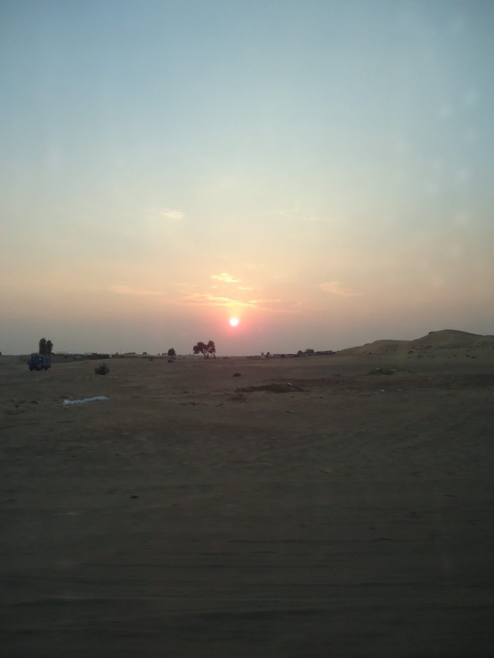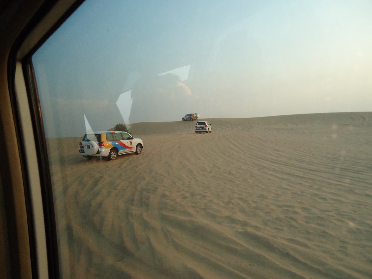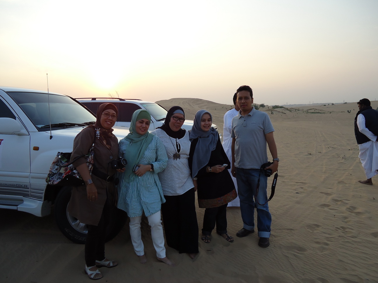 Mobil diarahkan oleh supir ke arah utara dengan waktu tempuh sekitar 45 menit dan berhenti di rest area.. Di situ para penumpang dipersilahkan bongkar muatan, alias pipis, sebelum perjalanan dilanjutkan.. Sementara para supir mengurangi volume udara yang mengisi ke-empat ban mobil.. Setelah semua ok, perjalanan dilanjutkan… Gak lama supir membawa mobil keluar dari jalan aspal masuk ke sand dunes… Rasanya seperti naik jet coaster… Tegang, cemas, ngagetin… Seruuu aja pokoknya….. !!! Hehehe… Tapi menurut kak Lisda yang semobil dengan aku dan juga Roy, ini belum maksimal… Safari yang pernah diikuti kak Lisda sebelumnya jauh lebih hebooohhh…, karena beneran bisa bikin mabok dan muntah orang yang gak kuat… Mungkin jalur yang diambil lebih pendek dan simple karena waktunya yang pendek yaaa… Menjelang magib, para supir memberhentikan mobil2 di salah satu sand dune.. Memberikan kesempatan bagi kami untuk berfoto-ria di padang pasir sambil menikmati sunset… Yuuuuppppp….. sunset on d desert.. Biasanya sunset yang ditunggu-tunggu kan di pantai yaa… Sama seperti di pantai, di gurun pun enaknya bertelanjang kaki… Dan karena sudah menjelang malam, pasir gurun terasa sejuk di kaki.. Hmmm nyamannya….