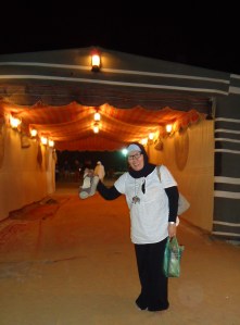 Selesai makan malam, para peserta safari diminta duduk disekitar segi empat tempat pertunjukan…, dannnnn pertunjukan dimulai… Pertunjukan pertama adalah seorang penari pria yang memakai rok lebar dan menari berputar2 selama beberapa belas menit.. Kuat banget tuuhh orang.. Gak pusing, apalagi mabok dan muntah.. Padahal kalo kita disuruh begitu, 3 puteran aja udah keleyengan… Hahaha… Rok yang dipakai ternyata 2 lapis dan ada lampunya.. Bahkan rok yang terakhir diangkat dan diputar-putar di atas kepalasemua penonton satu persatu.. Rasanya seperti berada di bawah kipas angin.. Di akhir pertunjukannya, penari pria itu menjemput seluruh peserta perempuan untuk menari bersama di tempat menari, kecuali………… perempuan-perempuan yang berbusana muslimah.. Alhamdulillah… Ini adalah salah satu saat dimana aku merasakan betapa terhormatnya menjadi perempuan berbusana muslim… Orang tidak berani mengajak kita menari di tempat umum… Sementara penari tersebut meminta semua peserta satu persatu menari, meliukkan tubuh di depan umum… Setelah penari laki-laki itu selesai menari, akhirnya muncul juga belly dancer.. Perempuan bertubuh tinggi dengan wajah khas arab dan rambut panjang terurai sampai melebihi pinggang. Busananya, hanya bra dan underwear yang ditutupi oleh kain tule beberapa lapis.. Perempuan itu menari dan menggerakkan otot2 perutnya… Mungkin buat sebahagian kesannya sexy dan indah ya.. Tapi di mataku, kok rasanya gak pantas ya perempuan mencari nafkah dengan seperti itu.. Aku juga merasa gak benar dengan menonton tarian ini… Semoga ini adalah yang pertama dan terakhir.. Hanya utnuk tahu, bukan untuk dinikmati, apalagi diulangi…