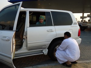 Setelah melihat Masjid Jumaerah, kami lalu makan siang di sebuah restaurant India.. Makanannya lumayan lezat…. Gak ngecewain lidah… Hehehe… Selesai makan kami segera kembali ke hotel, karena harus istirahat sebelum ikutan Desert Safari… Desert Safari…? Apa itu…? Desert Safari itu safari di padang pasir dengan menggunakan kendaraan 4 wheel drive… Hmmmm, gak sabar dan deg-deg-an… Karena aku pernah baca di sini, kalau gak kuat, ikutan desert safari bisa mabok sampai muntah2… Desert Safari kami mulai jam 16.30-an.. Telat dari jadwal yang seharusnya, jam 15.30, karena menunggu sesama anggota rombongan tapi gak muncul2… Padahal sejam jam 15-an di depan hotel sudah tersedian 6 unit mobil 4 wheel drive berwarna putih, yang masing2 dikendarai oleh seorang supir berbusana khas lelaki setempat, jubah putih, beberapa di antaranya memakai tutup kepala yang juga sangat khas Arab.. Mana wajahnya cakep2 pulaaa…. Hahahaha… Karena jumlah mobil yg sudah di-reserve ada 6, yang jumlah penumpang seharusnya 4 orang, sementara yang ikut cuma 11 orang, dan cuma 5 diantaranya laki-laki, mobil kami menjadi sangat longgar.. Pokoknya di tiap mobil harus ada satu laki-laki dari rombongan. Jadinya satu mobil tidak ada penumpangnya.. Sayang banget.., padahal supirnya cuakep banget lho… Hahahaha… Tapi gak berani lah ya naik mobil tanpa ada lelaki dari rombongan yang menemani…