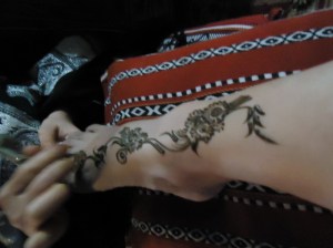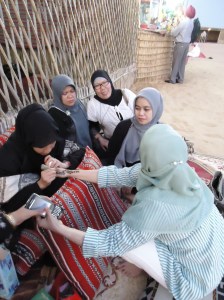 Apa emang rasanya naik onta…? Hahahahahahahahahahhahaha…. Pas naiknya siyyy deg-degan… Takut dengan reaksinya… Tapi ternyata waktu naik, cukup aman, ontanya tenang2 aja.. Kitanya ja yang deg2an.. Bahkan mengendarainya juga fine-fine aja… Yang ngagetin itu pas turun… Onta itu main njegruk aja turun tanpa aba-aba, tanpa tanda2… Bussseeeeettttttt daaaahhhhhh……. Hehehehe… Selesai kami naik onta, kami masuk ke area dalam kemah… Di sana sudah disiapkan tempat2 duduk berupa busa yang menghadap ke meja-meja panjang.. Selain itu juga ada tempat duduk melingkar yang dibatasi pelepah kering di sekelilingnya.. Juga ada tempat duduk di tepi2 tenda.., serta toko souvenier di dekat pintu masuk yang sekaligus berfungsi sebagai pintu keluar… Selain itu, di dekat pintu masuk terdapat tenda di kiri kanan yang menyediakan cemilan khas padang pasir, yaitu semacam pancake dan roti goring dicelup gula aren… Begitu masuk ke tenda, kami bergegas mencari perempuan tukang bikin henna.. Karena menurut tour guide yang orang Pakistan, di dalam paket desert safari peserta perempuan boleh minta dihias dengan henna. Setelah bertanya, kami segera menemukannya duduk di sebuah karpet di salah satu sisi tenda.. Perempuan pemasang henna itu ternyata berdarah Iran, yang sejak lahir sudah tinggal di Dubai, dan sudah bekerja di kemah tersebut lebih dari 10 tahun… Pemasangan henna untuk satu kali, apakah di tangan atau di kaki, tidak dipungut bayaran, alias bagian dari paket. Untuk pemasangan kedua dikenakan biaya DRH 10, atau sekitar Rp.24.000,-. Aku memutuskan untuk menghias tangan dan kaki kanan ku… Gadis penghias henna itu begitu terampil menggoreskan henna langsung dari tube dan membentuk gambar-gambar yang feminim dan artistic… Keren bangetsss… Dan tiap-tiap orang mendapat gambar yang berbeda, tidak menggunakan pola atau pattern seperti yang pernah ku lihat di Little India, Singapore. Setelah selesai digambar, henna harus dibiarkan minimal 30 menit, baru dibersihkan…