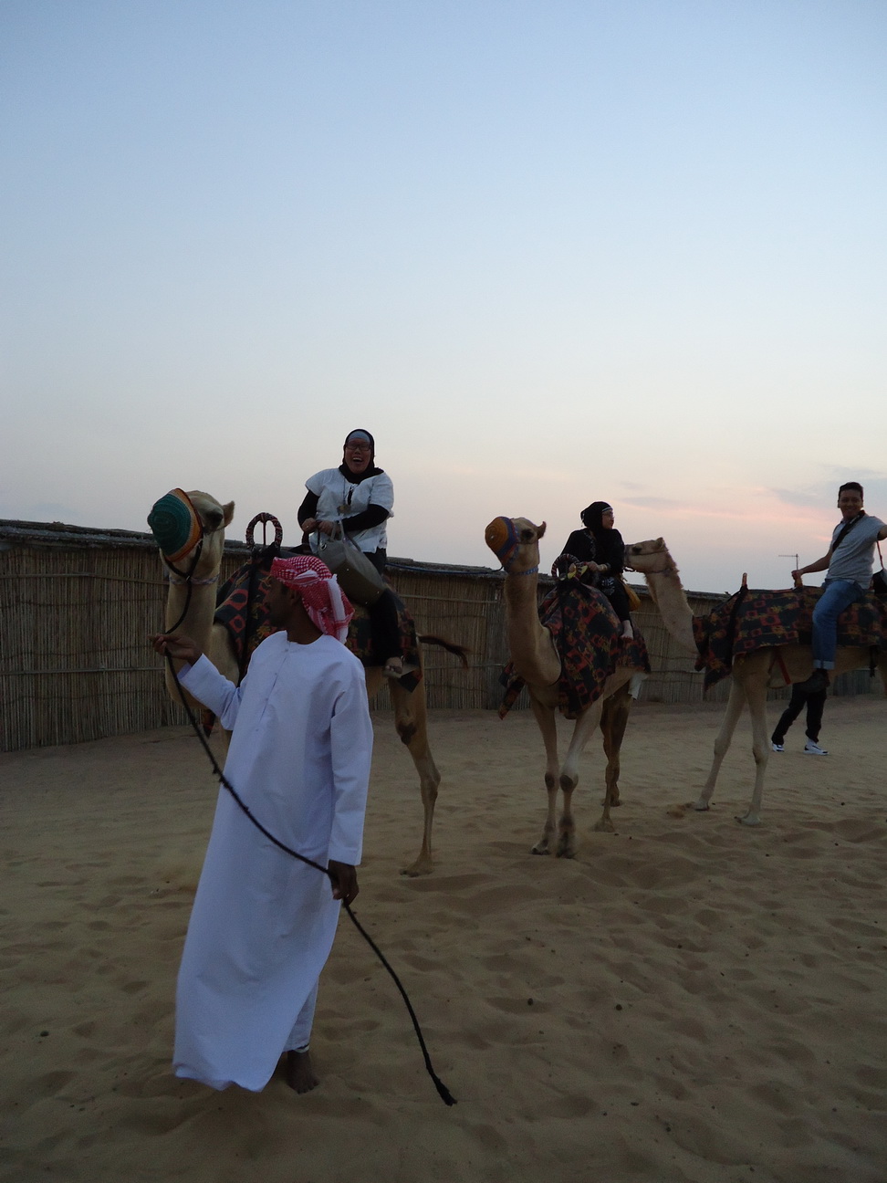 Selesai berfoto-foto dan menikmati sunset, perjalanan dilanjutkan… Beberapa puluh menit kemudian kami sampai di sebuah kawasan yang dibatasi pagar kawat duri dan di tengah-tengahnya terdapat tenda berukuran besar… Di sampingnya terparkir sebuah mobil ATV buat yang ingin merasakan nyetir di padang pasir, juga terdapat beberapa ekor onta.. ONTA…? Iyaaa… Onta itu disediakan bagi peserta yang mau mencoba rasanya mengendarai onta..