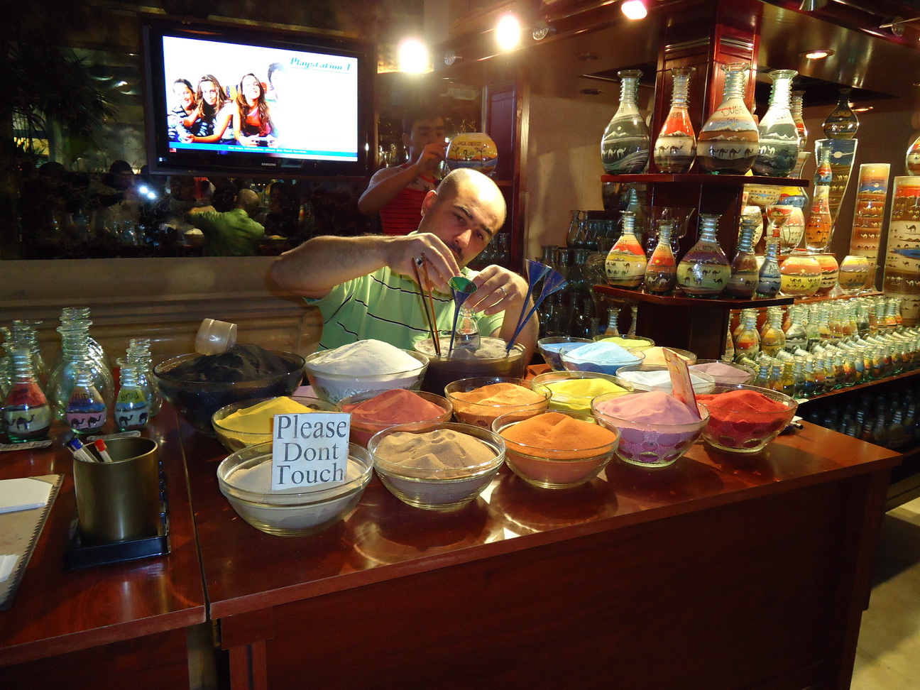 Tapi di salah satu lorong aku menemukan sebuah counter yang menjual pasir gurun yang ditata sedemikian rupa di dalam botol sehingga berbentuk lukisan… Di samping counter tersebut duduk si seniman yang mempertunjukkan keterampilannya. Sungguh keterampilan yang keren… Ketika ku tanya dimana dia mempelajari keterampilan ini, dia bilang di Yordania..