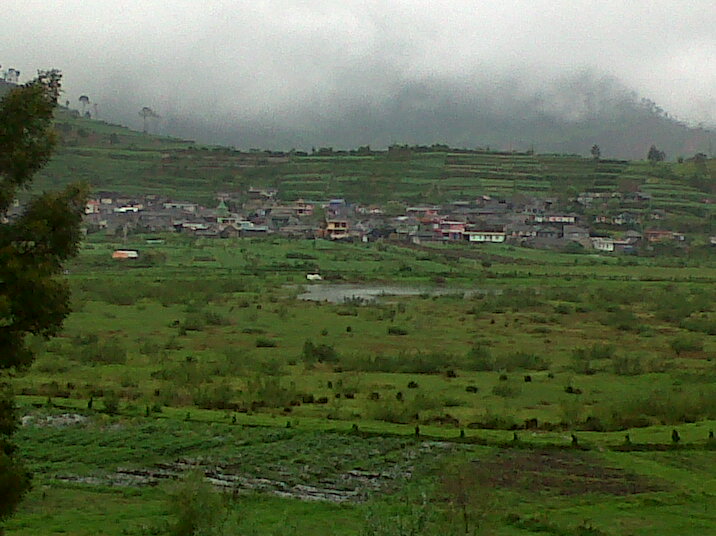 Dari Wonosobo harus ditempuh 25 km lagi untuk bisa sampai ke Dieng.. Namun ini perjalanan yang menyenangkan…, karena menyusuri bukit-bukit dan pegunungan… Iya, Dieng berada diantara pegunungan karena Dieng diperkirakan dulunya merupakan danau bekas kawah gunung api yang sudah mati..