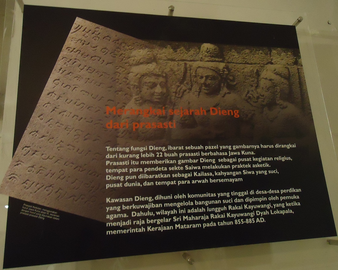 Menurut informasi di Museum yang diberi nama Kailasa, yang terdapat di Dieng, berdasarkan 22 buah prasasti berbahasa Jawa Kuna, Dieng yang berasal dari kata Dhi Hyang (tempat para roh), dahulu berfungsi sebagai pusat kegiatan religius, tempat para pendeta sekte Saiwa melakukan praktek asketik, dimana Dieng diibaratkan sebagai Kailasa artinya Kahyangan Siwa yang Suci, Pusat Dunia dan Tempat Para Arwah Bersemayam…
