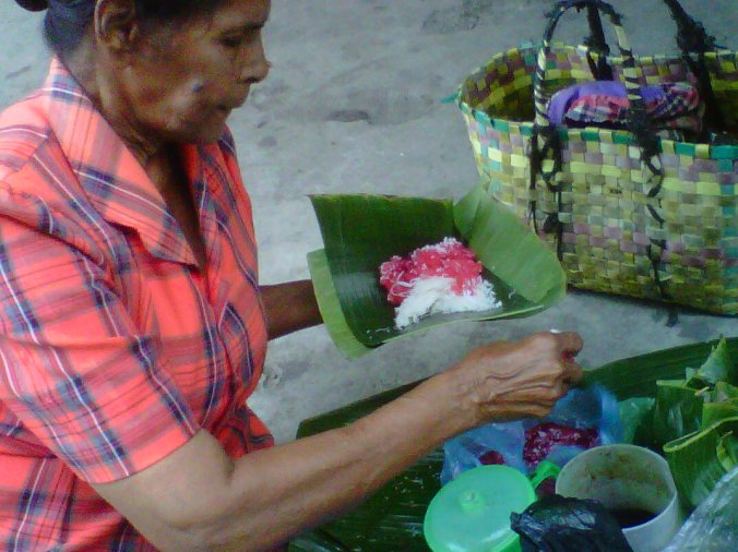 Naaahhhh…., pas hari lebaran, 31 Agustus 2011, aku maik motor dengan adik ku Ivo untuk suatu keperluan… Gak jauh dari rumah, di traffic light di sekitar jalan Sei Wampu, kami melihat seorang perempuan Tamil melintas dengan menjunjung tampah dan membawa keranjang plastik di salah satu tangannya.., tapi tanpa suara…, tanpa teriakan apa pun.. Aku lalu menyapa…, menanyakan apa yang dia jajakan… Dia bilang, “putu mayong”.. Aku lagsung meminta dia mencari tempat untuk berhenti dan membuka dagangannya.., sementara aku menepikan motor yang kami kendarai… Hehehehe… Sungguh hadiah lebaran yang istimewa… : Putu mayong dan cenil di hari lebaran…