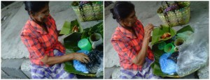Biasanya perempuan keturunan Tamil India itu membawa dagangannya yang diletakkan dalam tampah atau nyiru yang dilapisi lembaran-lembaran daun pisang… Saat jualan keliling daerah perumahan, tampah atau nyiru itu biasanya dijunjung di kepala… Adapun stok panganan yang mau dijual plus pelengkapnya dibawa dalam keranjan plastik yang dijinjing…