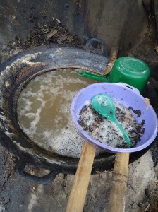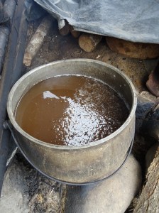 Air nira hasil sadapan lalu dimasak dengan tungku berbahan bakar kayu sampai mengental.. Kebetulan yang aku temukan di Sibadoar, tungku pemasak nira diletakkan di depan rumah, di tepi jalan.., hanya dilindungi degan pagar-pagar kayu dan atap seng seadanya… Agar air nira yang dimasak bersih dan tak ada kotoran, air nira disaring saat akan dituangkan ke kuali… Manisnya air nira terlihat dari banyaknya lebah-lebah yang tertinggal di saringan… Hmmmmmm… Btw, selain diolah jadi nira, ada juga penduduk kampung yang mengolah air nira menjadi tuak, sejenis minuman yang mengandung alkohol sebagai hasil fermentasi…
