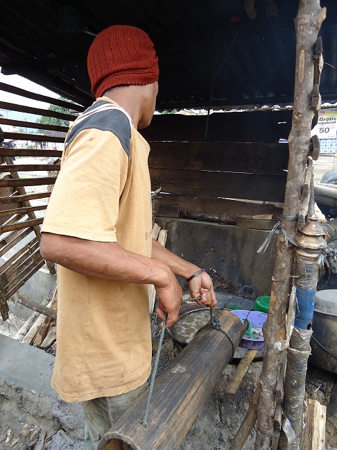 Bahan baku gula bargot adalah air bargot alias air yang disadap dari tandan jantan pohon nira. Selama disadap, air biasanya ditampung dalam tabung-tabung bambu… Biasanya penyadap nira membawa beberapa tabung sekaligus untuk dipasang di pohon-pohon nira.. Untuk memudahkan, aku lihat salah seorang penyadap di Sibadoar membawa tabung-tabungnya dengan dorongan…