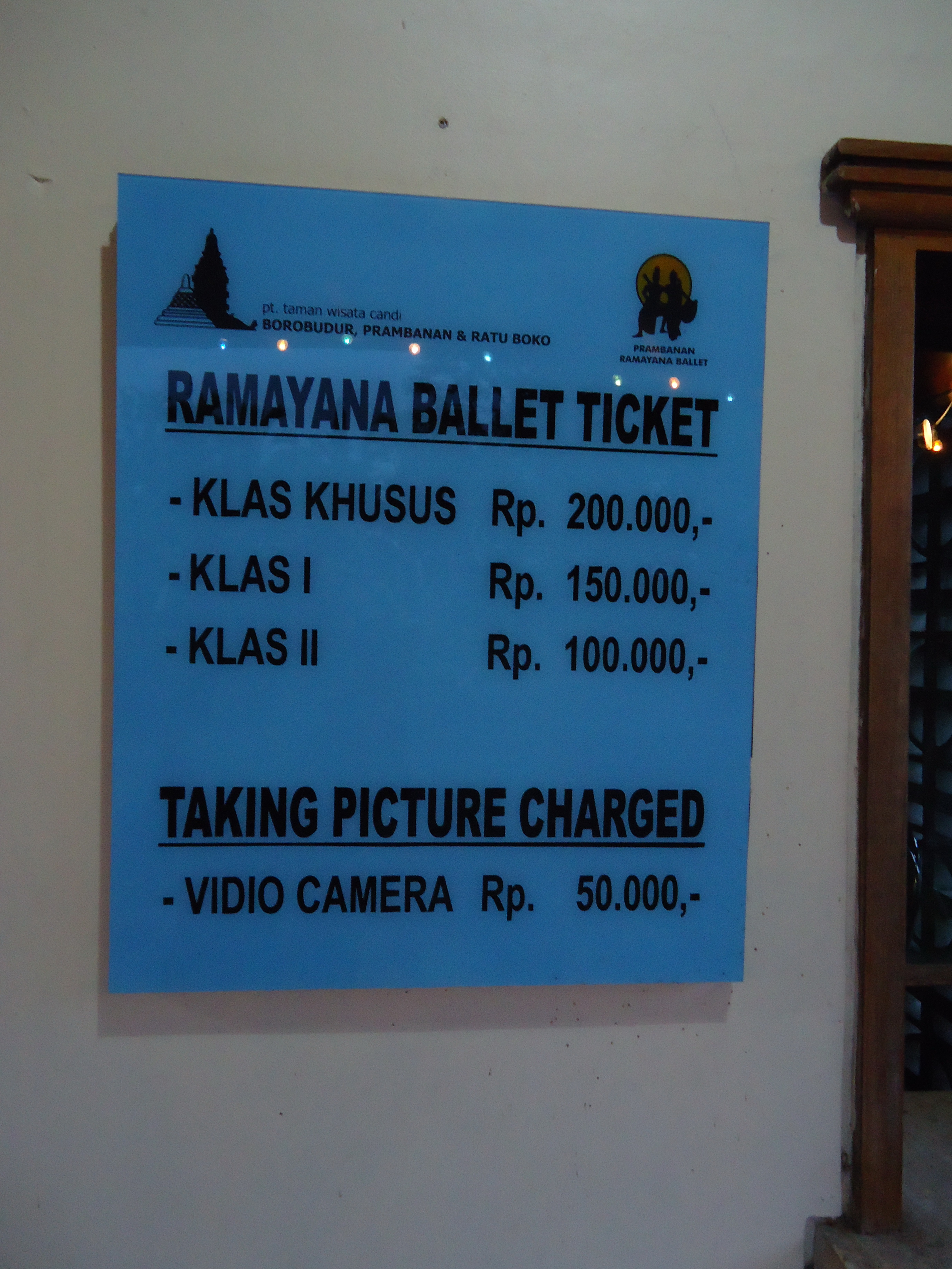 Berapa harga tiketnya…? Pada saat aku kesana, aku sempat memotret daftar harga yang tertulis samping di ticket box.. Larang alias mahal yaaa….?? Klo menurut aku yang udah melihat pertunjukannya, ya enggak laahhh… Wajar… Karena ada banyak pihak yang terlibat dan pantas mendapatkan imbalan dari apa yang mereka berikan bagi penonton.. Ada para penari yang penampilannya luar biasa, juga para pemain musik dan orang-orang yang bekerja sebagai tenaga pendukung, seperti penata lampu, penata suara, sampai petugas kebersihan dan keamanan… Lagi pula masa kita tidak mau menghargai kinerja seniman kita sendiri… Masa harus wisatawan asing saja yang menikmati karya seni anak negeri… Rugi laaahhh… Nanti orang asing paham dan bisa mengapresiasi seni dan budaya kita, sementara kitanya sibuk mengembangkan seni yang berorientasi ke barat sana…