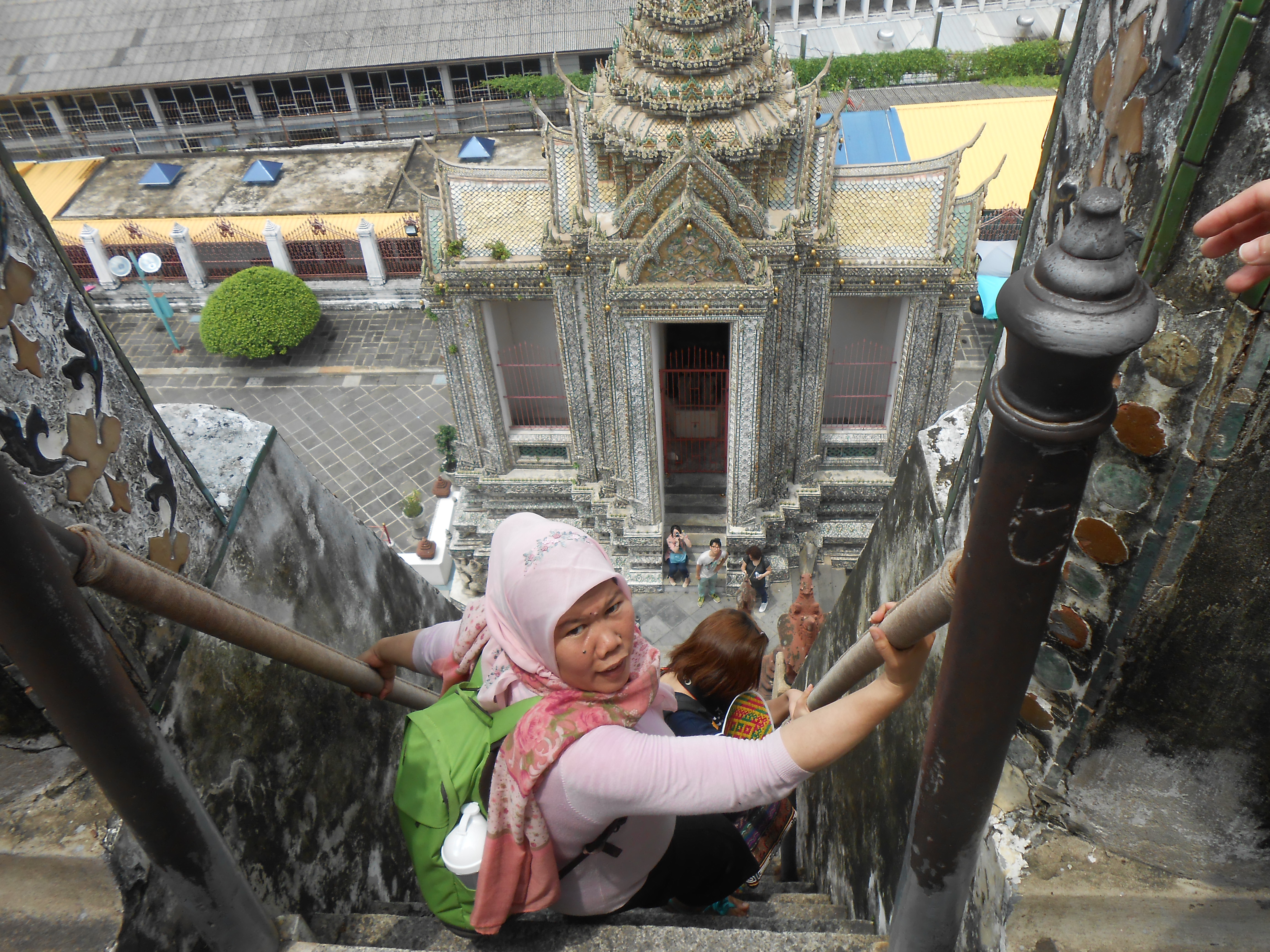 Dari 5 bangunan yang bisa dinaiki hanya bangunan utama.. Pada bangunan utama ini ada 3 lantai yang bisa dinaiki.., dengan tangga-tangga besi yang sangat curam, hampir 90 derajat, di keempat sisi. Dari lantai ketiga yang bisa dinaiki dan dikeililingi, kita bisa melihat pemandangan Chao Phraya, dan kawasan di seberang sungai, dimana terdapat pasar dan Wat Pho, candi tertua di Bangkok…