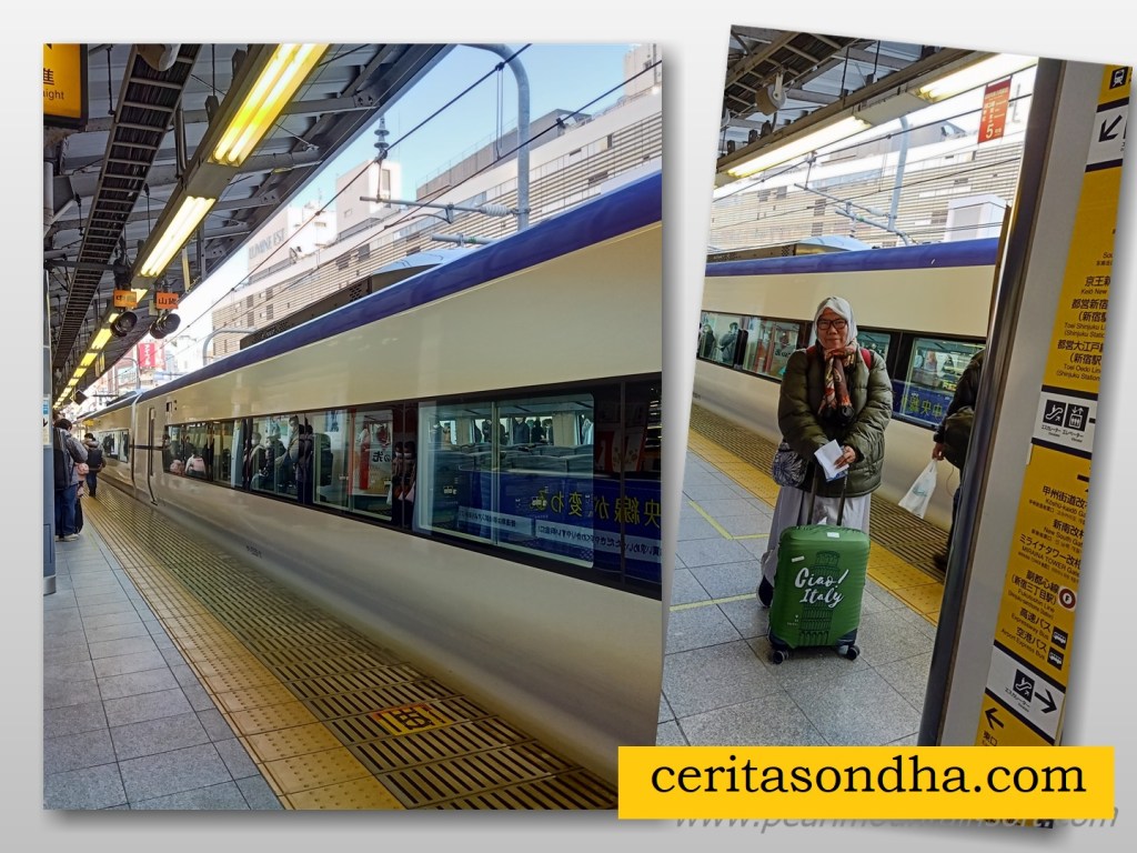 Dari Yotsuya Station kami menuju Shinjuku Station untuk menaiki Limited Express Train menuju Matsumoto, dengan menggunakan JR Pass. Ini pengalaman pertama naik kereta untuk jarak yang relatif jauh, sekitar 3 jam, dan karena belum pengalaman, kami langsung naik saja ke kereta. Padahal JR Pass yang kami beli, bila ingin naik ke kereta harus reserve tempat duduk dulu di loket JR Station tempat keberangkatan. So, jadilah kami diperkenankan duduk di tempat duduk yang kosong, dan harus pindah ke tempat duduk lain, bila penumpang pemesan tempat duduk naik di station berikutnya. Tanda kursi yang kosong, lampu di sebelah nomor tempat duduk yang terdapat di dinding samping, akan berwarna merah. Bila pada station berikutnya, ada penumpang yang akan naik dan sudah reserve tempat duduk tersebut, maka lampu berubah warna menjadi hijau. Penumpang tanpa kursi yang numpang duduk di nomor tersebut, silahkan pindah ke kursi lain. Bila tak ada kursi yang kosong, silahkan berdiri di ujung gerbong penumpang. π π π Lelah…? Pasti. Tapi terobati dengan pemandangan indah di sepanjang perjalanan, termasuk pemandangan Gunung Fuji di sisi kiri kereta di awal perjalanan.