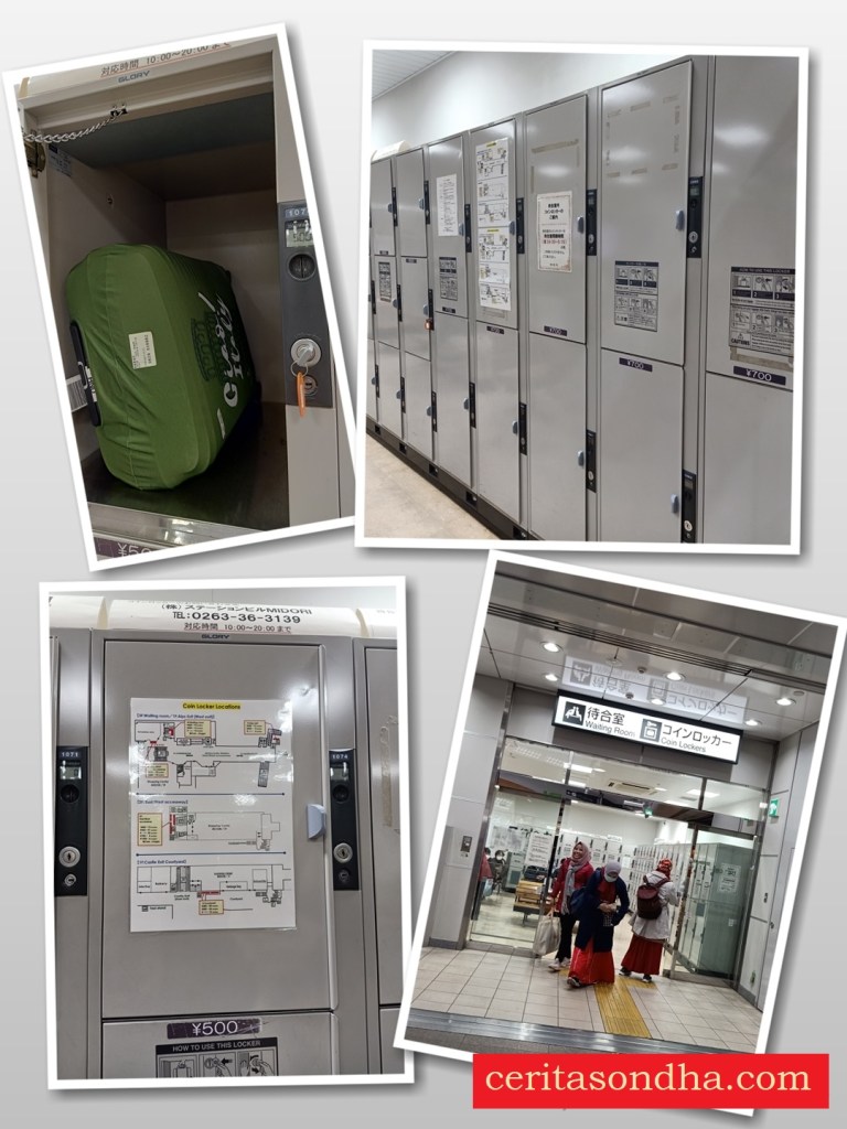Kami sampai di Matsumoto Station sekitar jam 12.00 waktu setempat. Kami langsung mencari locker dan menitipkan koper-koper kami di sana. Loker di Matsumoto Station berada di lantai dasar, di seberang Starbucks, satu ruangan dengan waiting room. Harga sewa locker tergantung besar ruang locker yang akan digunakan. Untuk menggunakan locker tersebut, kita harus menggunakan coin Yen 100. Bila tak punya, kita bisa menukar di toko-toko di seberang locker, mereka bersedia membantu tanpa kita harus belanja di toko tersebut. Cara menggunakan locker, terdapat di pintu-pintu locker dalam dua bahasa, Bahasa Jepang dan Bahasa Inggris. Jadi tak perlu khawatir.