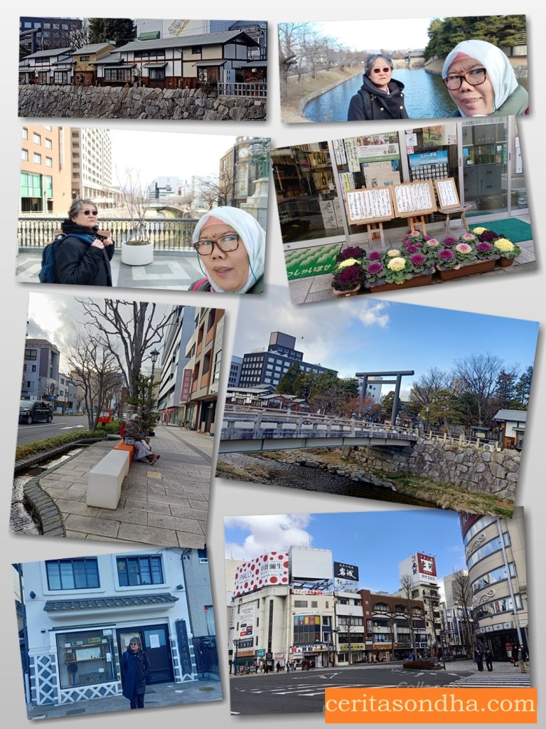 Dari Stasiun Matsumoto kami berjalan kaki mengikuti arahan Maps Go, ke arah Istana Matsumoto. Jarak tempuh sekitar 1,4 kilometer. Jauh….? Lumayan, tapi pemandangan di sepanjang jalan sungguh cantik.. Di kiri kanan berdiri toko-toko dengan kaca-kaca besar yang memajang aneka barang cantik dan tertata apik.. Sungai yang melintasi kota ini bersih, dan dilintasi jembatan-jembatan yang juga cantik. Kota ini benar-benar ramah untuk pejalan kaki, bahkan di beberapa bagian ruas ajalan tersedia bangku-bangku yang nyaman untuk pejalan kaki beristirahat sejenak.
