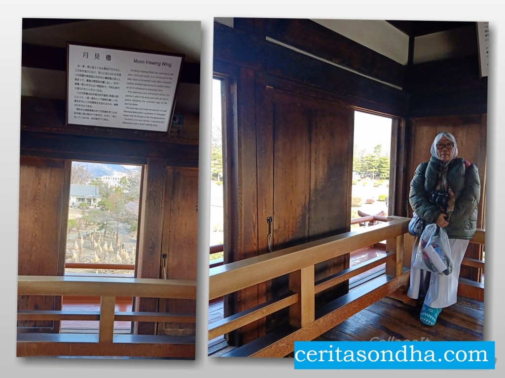 Pada lantai teratas atau lantai 6, terdapat Moon-Viewing Wing, alias sayap atau balkon untuk memnadang bulan. Romantisnya bangsawan kerajaan Jepang tempo dulu ya… Balkon ini menghadap ke arah utara, timur dan selatan. Ruangan ini dibangun berdasarkan arahan Naomasa Matsudaira, cucu dari Tokugawa Ieyasu, Shogun pertama dari periode Tokugawa. Saat ini tinggal 2 istana saja yang masih memiliki Moon-Viewing Wing, yaitu istanam Matsumoto dan istana di Kota Okayama , Okayama Perfeture.