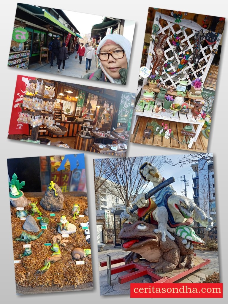 Selesai melihat bahagian dalam menara utama Istana Matsumoto, kami menlanjutkan berjalan kaki. Tujuannya ke Nakamachi Dori, sebuah shopping strret untuk wisatawan, yang berjarak sekitar 600 meter Istana Matsumoto. .Tapi di tengah perjalanan kami menemukan Nawate Dori, sebuah jalan yang panjangnya sekitar 100 meter saja, namun di kiri kanannya banyak toko-toko kecil yang menjual berbagai produk yang lucu-lucu, berbentuk kodok. Nawate Dori ditandai dengan patung kodok bergaya ala ninja di salah satu dudut di pangkal jalan.