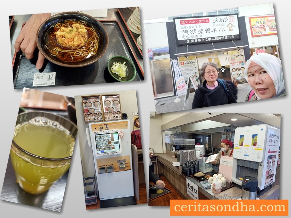 Di samping Matsumoto Station kami menemukan Soba Ogiso Mill Matsumoto Ekimae, kedai yang menjual soba, makanan khas Jepang. Soba adalah mie yang terbuat dari biji soba, atau gandum kuda (Latin : Fagopyrum esculentum). Soba dihidangkan dengan kuah miso, dengan pilihan miso dingin, atau miso panas. Miso di Jepang tidak sama dengan miso di tempat kita. Miso di Jepang adalah sup yang dibuat dengan menggunakan dashi, kaldu khas Jepang. Di kedai Soba Ogio, pilihan protein untuk menyantap soba adalah ayam, udang atau kerang, no beef. Ini yang membuat diriku merasa aman untuk masuk ke kedai ini. Selain itu di kedai ini juga tersedia kakiage (gorengan sayur iris pakai tepung) dan ubi jalar goreng untuk teman menyantap soba.
