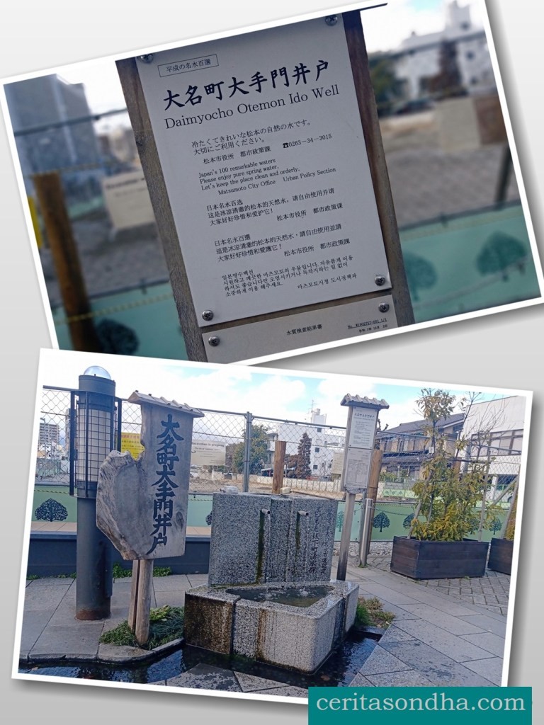 Ada yang unik di Kota Matsumoto. Di beberapa sudut jalan terdapat pancuran kecil, Daimyocho Otemon Ido Well, yang airnya bersumber dari mata air pegunungan (spring). Airnya bersih dan layak minum. Para pejalan kaki bisa singgah, mengambil air dari pancuran dengan centong yang disediakan, dan langsung meminumnya. Apa rasa airnya? Gak ada rasa apa-apa, tawar tapi sejuk dan segar…